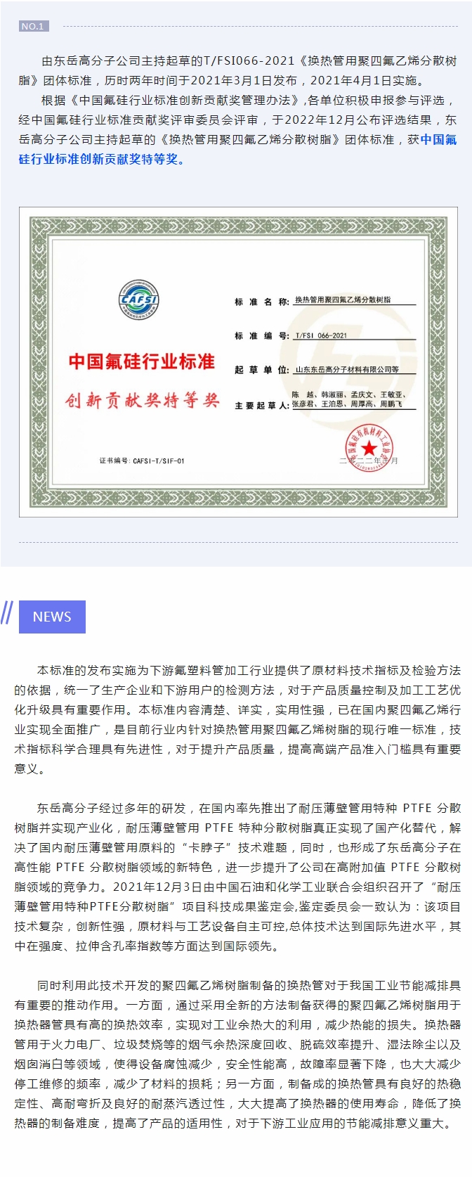 東岳高分子公司獲中國氟硅行業標準創新貢獻獎